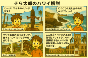 やっほー!ぼく、そら太郎だよ。ハワイってね、にこにこ笑顔と海の青でできた“たいようの実験室”。写真の場所にもつながるスポットを、ぼくの目線でキュッと解説するね!🌺🏄♂️ 歴史のあらすじ 行きたくなる注目ポイント 1) […]
