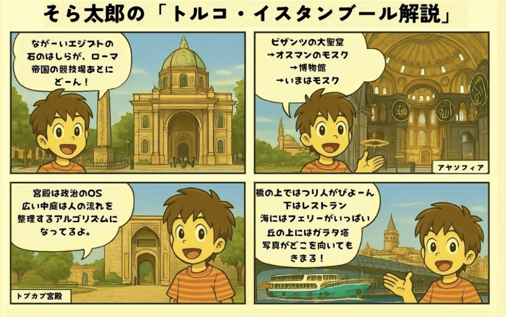 「イスタンブールって、時間の積み木でできたまちなんだ!エジプト→ローマ→ビザンツ→オスマン→いま——ぜんぶがいっしょに呼吸してる。